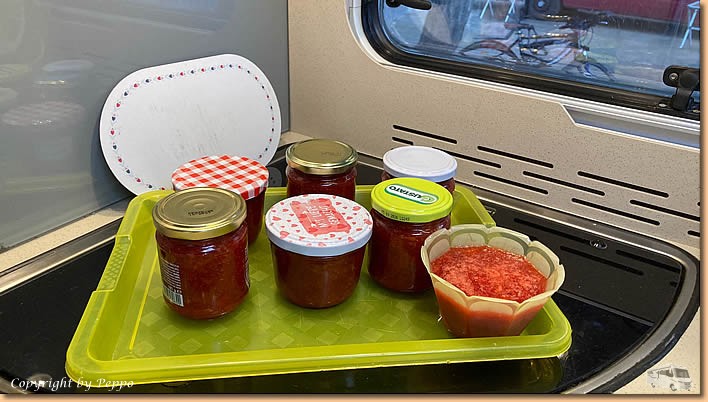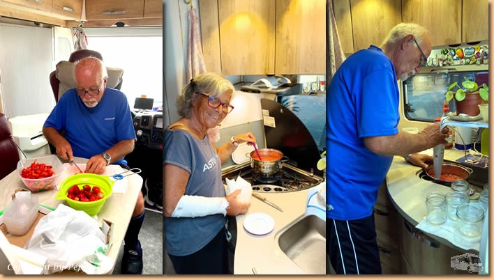 | Ganz ohne Küchendienst geht's aber trotzdem nicht, denn der Gemüsemann kommt mit Erdbeeren vorbei und unter Anleitung produzieren wir meine erste Marmelade. |