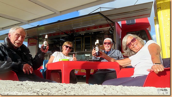 | Die vergangene Nacht und der heutige Tag sind bis jetzt verhältnismässig friedlich verlaufen. Regen und starke Böen sind noch ausgeblieben, trotzdem werden weitere Vorkehrungen für die kommende Nacht und den morgigen Tag getroffen. Die ersten Reihen am Meer sind komplett leer, alles nach hinten, denn es ist auch mit hohem Wellengang zu rechnen. Auf meine Bitte haben zwei Camper ihre PKW vor unser Vorzelt gefahren, jeder Schutz ist willkommen. |