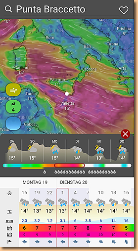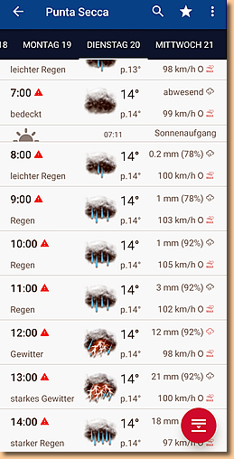 | Gerade bekommen wir eine Wetterwarnung herein, der Regen soll stärker werden und die ganze Nacht und auch morgen anhalten. Ganz erledigt ist die Sache anscheinend doch noch nicht. Morgen wissen wir mehr. Da die Nacht doch etwas kurz war ist bald Matratzenhorchdienst angesagt. Wir hoffen, Zyklon Harry lässt uns diese Nacht etwas ruhiger schlafen. |