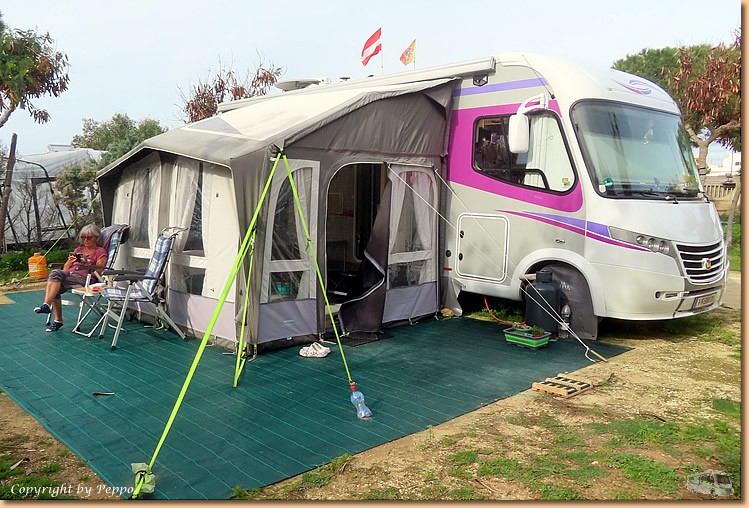 | Laut Wetterbericht stehen uns in den nächsten 3 Tagen Regen mit stellenweise 200 - 300 Liter, starker Wind mit Böen bis knapp über 100 km/h ins Haus. Also treffen wir einige Vorkehrungen und hoffen, dass unser Vorzelt sich tapfer gegen das Chaos stemmt. Zusätzliche Sturmleinen werden hoffentlich helfen, sämtliche Küchengeräte werden im Womo verstaut um im Ernstfall den Schaden etwas geringer zu halten. |