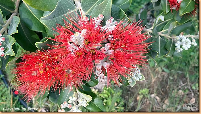 | Die Nacht verläuft ziemlich stürmisch, aber die positive Meldung gleich vorweg. Unser Zelt hat alles bestens überstanden und wird wohl hoffentlich auch den heutigen Böen standhalten. Der angekündigte Starkregen ist auch ausgeblieben, allerdings gibt es ständigen leichten Regen, aber damit können wir gut leben. Wenn wir Berichte aus anderen Regionen lesen sind wir wieder einmal gut davongekommen. Wir wollen ein paar Fotos machen, drehen aber bald wieder um, gegen den Sturm anzukämpfen ist nicht lustig, im Womo ist es wesentlich gemütlicher. |