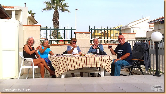 | Herrlicher Sonnenschein begleitet uns durch den ganzen Tag. Am Vormittag radeln wir zum Einkaufen nach Santa Croce. Bald geht's aber wieder retour denn um 12:30 Uhr sind Ulrike, Wolfgang und wir bei Ute eingeladen. |