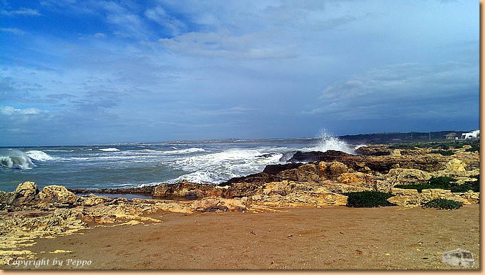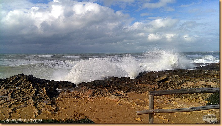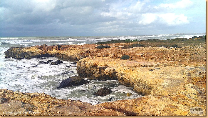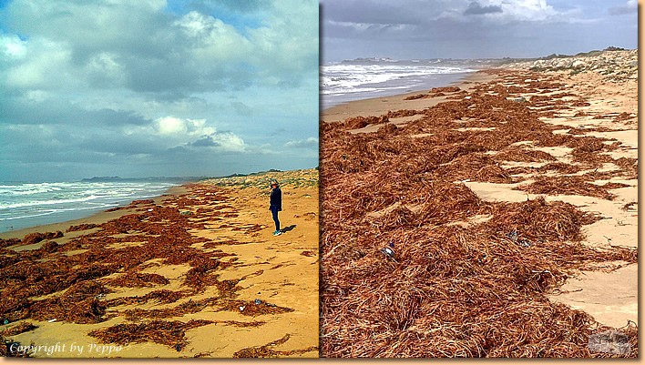 | Anschliessend spazieren wir den Klippen entlang Richtung Naturreservat. Über die Launen Neptuns regen wir uns gar nicht mehr auf, tagelang ist er schon äusserst schlecht drauf, ans Baden ist überhaupt nicht zu denken. Am Strand entlang des Parks ist fast kein Weiterkommen. Unmengen von angeschwemmten Seegrasballen liegen herum, gottseidank hält sich der Plastikmüll in Grenzen. |