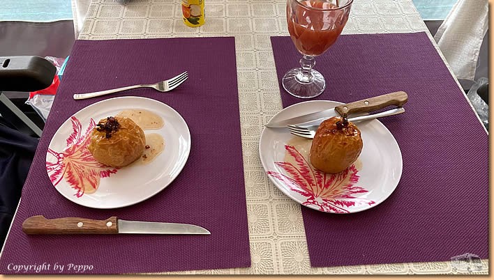 | Die nächsten grauen Wolken ziehen auf, wir treten den Rückzug an und treffen gerade noch trocken zuhause ein. Ab jetzt gibt's nur mehr Hüttenschicht, Regenschauer und zunehmende Windböen machen es draussen ungemütlich. Im Vorzelt ist es angenehm warm und unser heutiges Dessert, Bratapfel, kommt gerade recht. Allen einen schönen Abend, ciao bis morgen! |