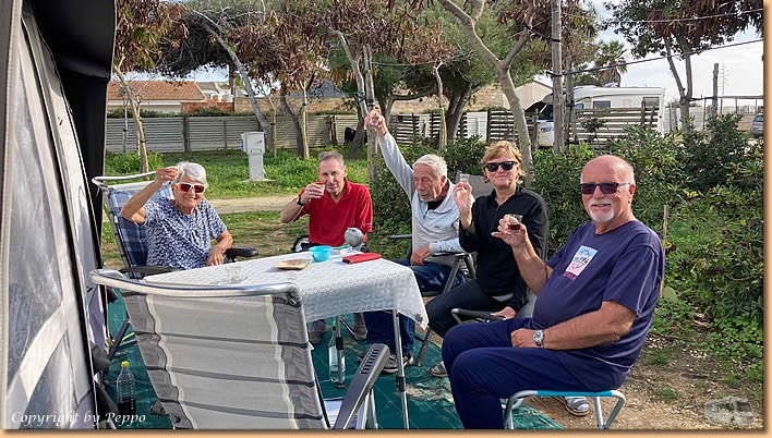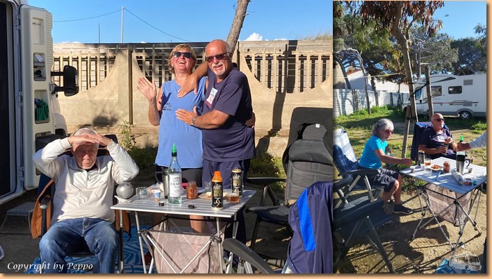 | Regenschauer am Vormittag, zu Mittag kommt die Sonne durch und es wird angenehm warm. Das heisst, Sesseln und Tisch vor's Womo um mit Ulrike und Wolfgang die restlichen Babà mit Espressi zu verspeisen Unsere neuen Nachbarn Rosmarie und Franz aus St. Johann im Pongau kommen dazu und in dieser netten Runde vergeht die Zeit wie im Nu. |